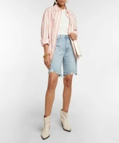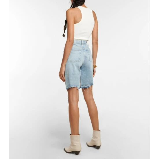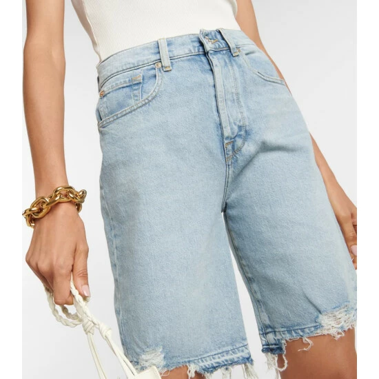 7 For All Mankind adds a new edge to its signature Andy denim shorts with distressed hems. The classic five-pocket design is cut from light-wash denim and has a concealed button closure.