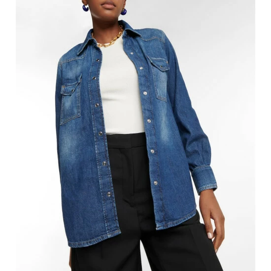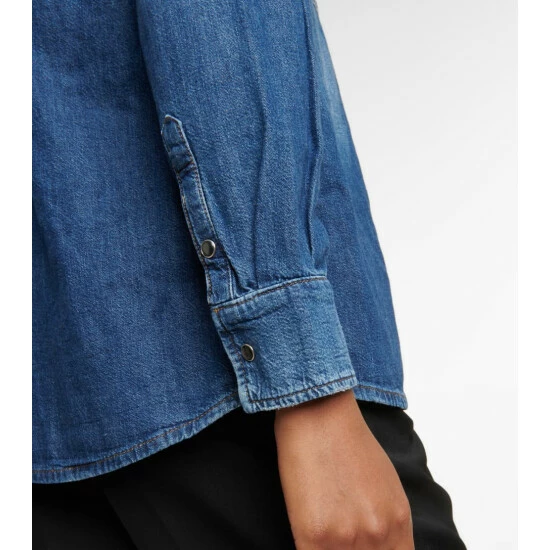 7 For All Mankind designs the Emilia denim shirt in a tried-and-true cut. Made from rich dark-wash denim, the relaxed-fit design has dual patch pockets and contrast top-stitching for a vintage-inspired look.