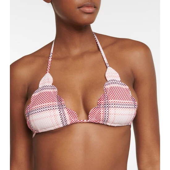 The Broadway bikini top from Marysia features an eclectic checked pattern. It has scalloped cups and secures with self-ties at the back, including at the halterneck. Match with the coordinating Mott bottoms.