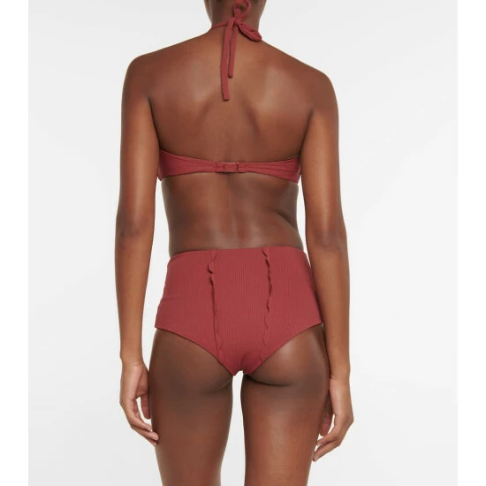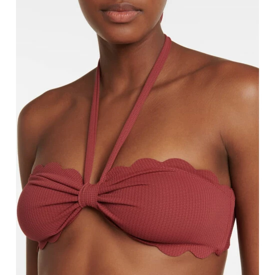 The Chesapeake bikini top from Marysia is anchored with a halterneck that’s threaded through at the front of the bust. It’s made from textured swim jersey with brand-typical scalloped edges.
