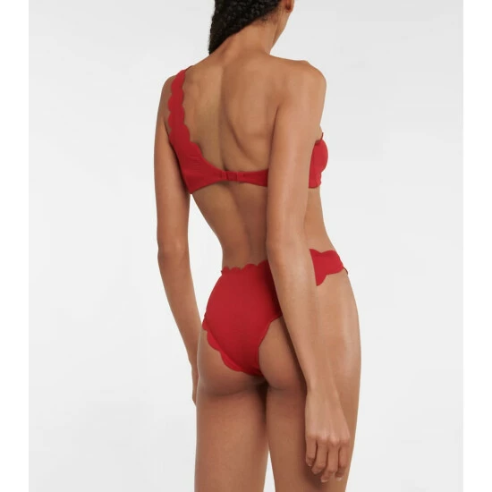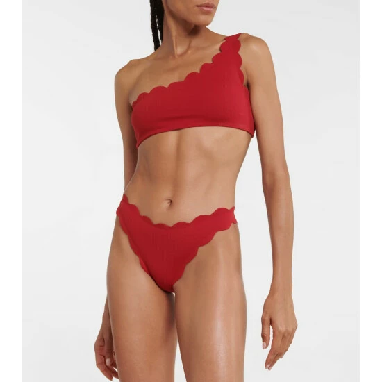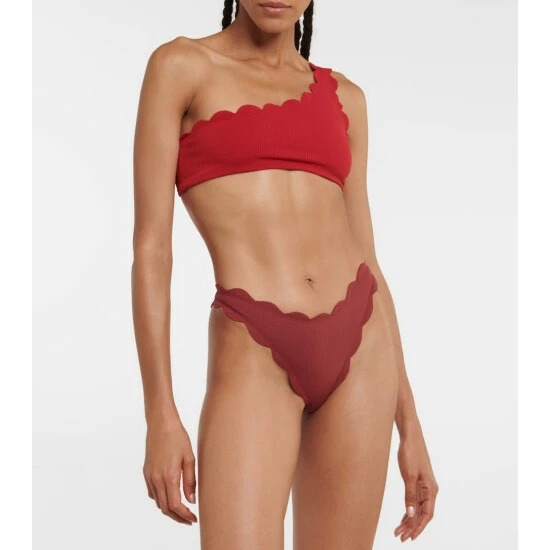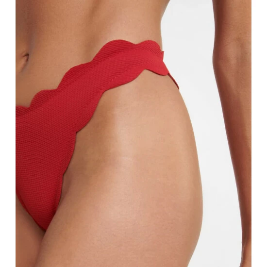Featuring Marysia’s signature hand-cut scalloped trims, the North red bikini bottoms are a bold style that sits high on the hips and offers minimal coverage.
