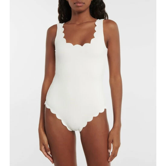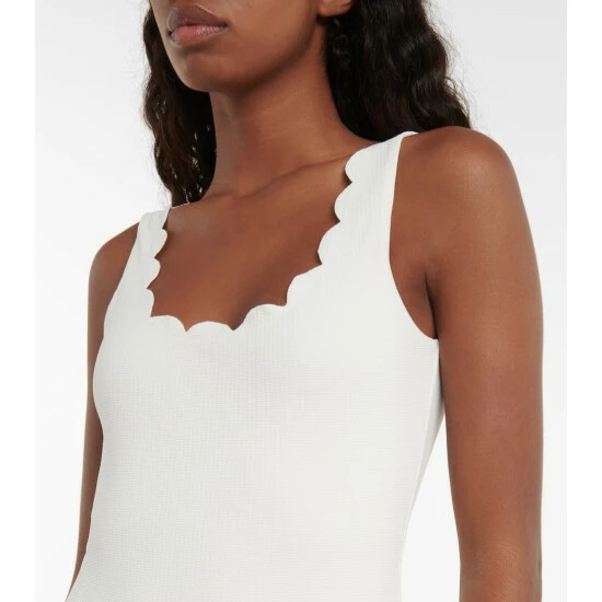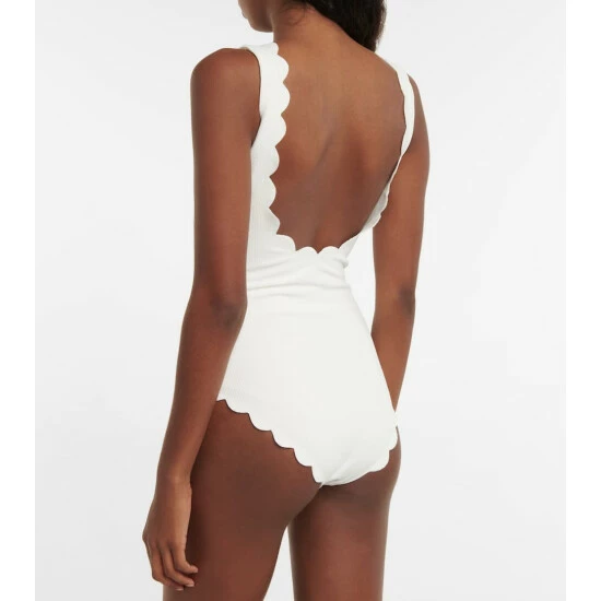Updated in the label’s “Coconut” cream colorway this season, Marysia’s signature Palm Springs swimsuit has us dreaming of sandy beaches and sunny poolsides. Crafted from the brand’s signature textured Italian basketweave swim fabric, this classic scooped maillot is complete with scalloped edges for a modern take on femininity.