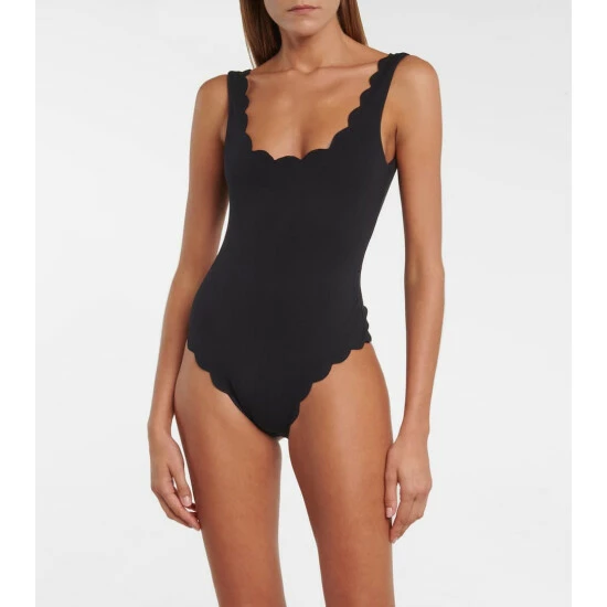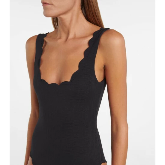 Marysia’s signature black Palm Springs swimsuit is made in part from recycled nylon for a more sustainable fabrication. It features the label’s signature hand-cut scalloped edges along the neckline and leg openings.