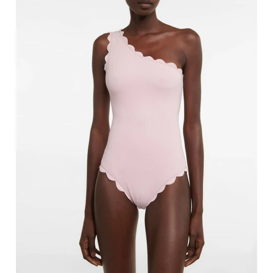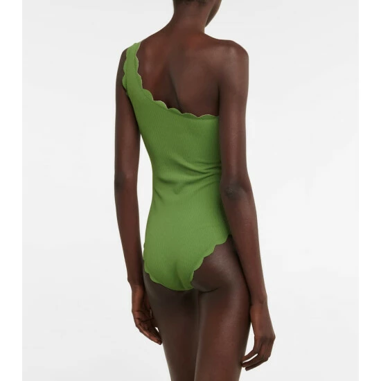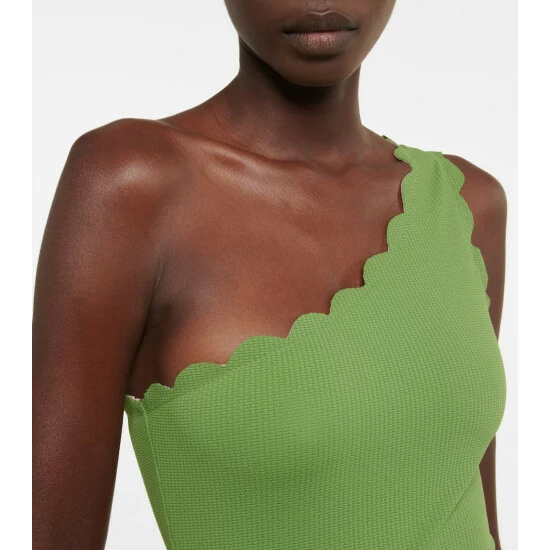 Make a glamorous statement at the poolside in the one-shoulder Santa Barbara swimsuit from Marysia. Made from stretchy basketweave fabric, the green and pink design is accented with brand’s signature hand-cut scalloped edges.
