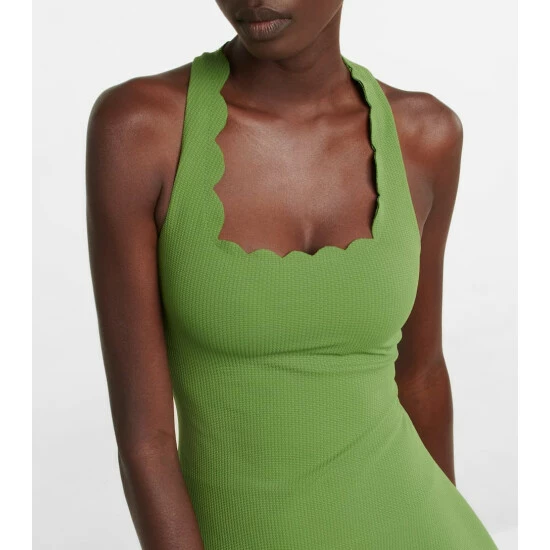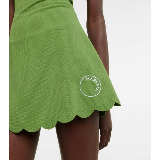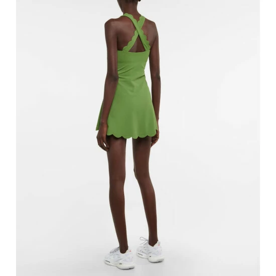 The Serena tennis minidress from Marysia is designed for wear both on and off the court. Made from green stretch jersey, it has scallop-edge hems and includes padded cups for support.